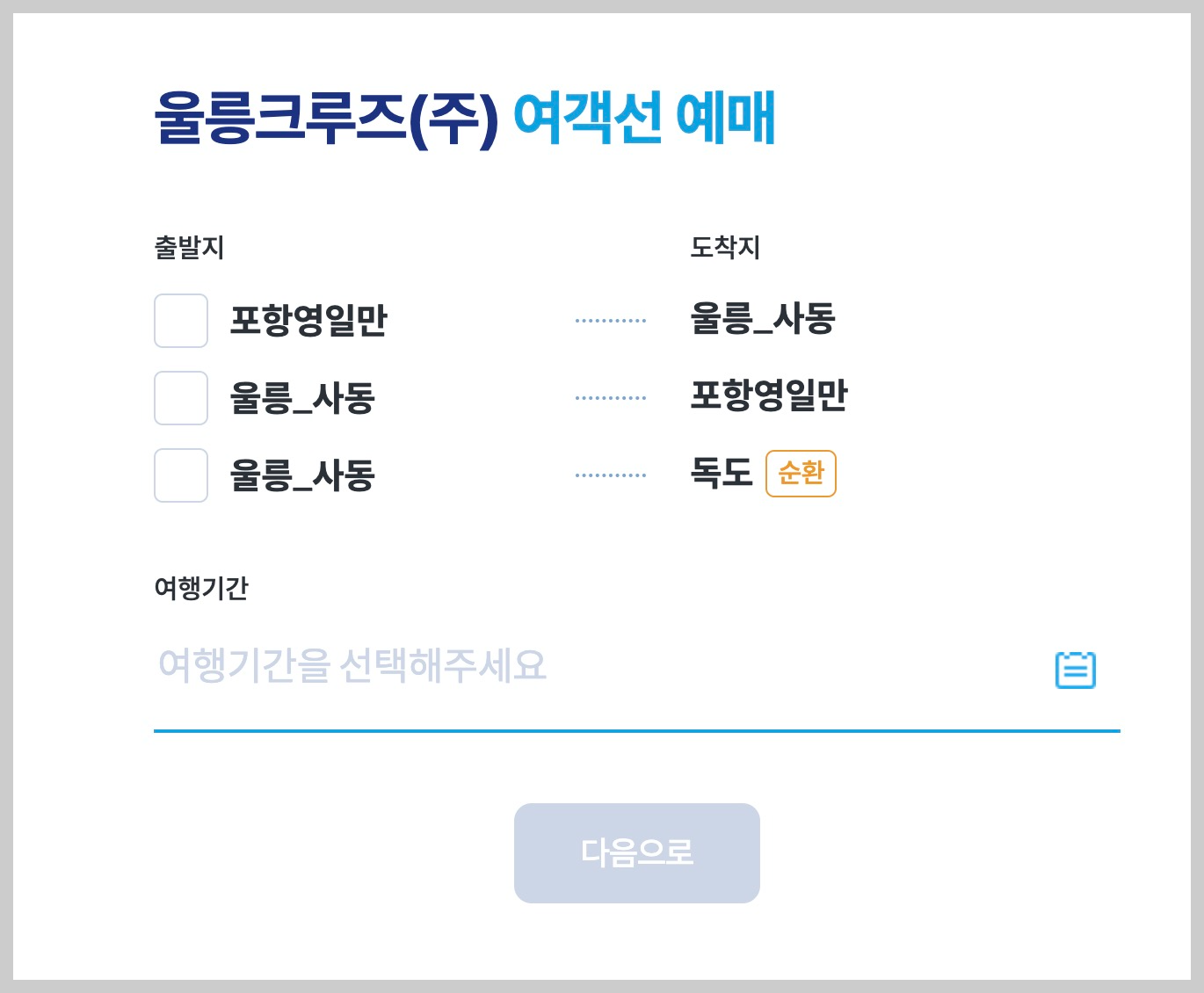 | 울릉크루즈 | 포항 → 울릉 | 23:00 | 다음 날 02:00 | 약 3시간 |