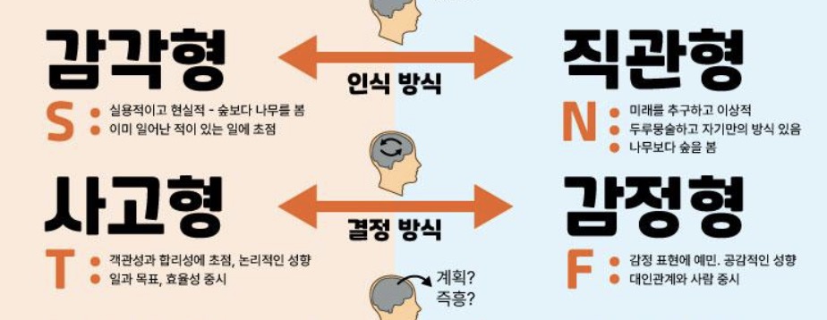 | 정보 인식 | S (감각) / N (직관) | 실제 정보에 집중하는지, 가능성과 미래에 집중하는지 |