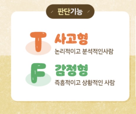 | 판단 방식 | T (사고) / F (감정) | 이성적으로 판단하는지, 사람 중심으로 판단하는지 |