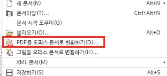 - 사용법: 한컴오피스 실행 → [파일] → [PDF를 문서로 변환] 클릭